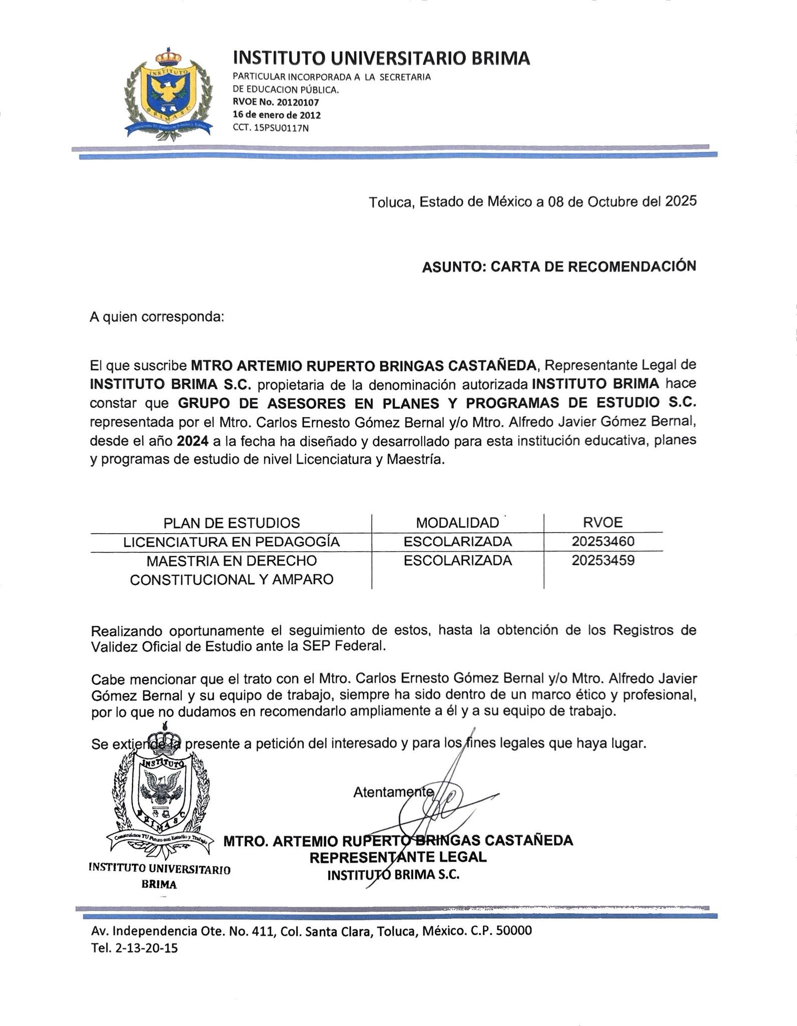 Felicitamos INSTITUTO BRIMA S.C. propietaria de la denominación autorizada INSTITUTO UNIVERSITARIO BRIMA por la obtención de sus DOS nuevos RVOE´S: LICENCIATURA EN PEDAGOGÍA, MODALIDAD ESCOLARIZADA, RVOE 20253460, MAESTRIA EN DERECHO CONSTITUCIONAL Y AMPARO, MODALIDAD ESCOLARIZADA, RVOE 20253459.